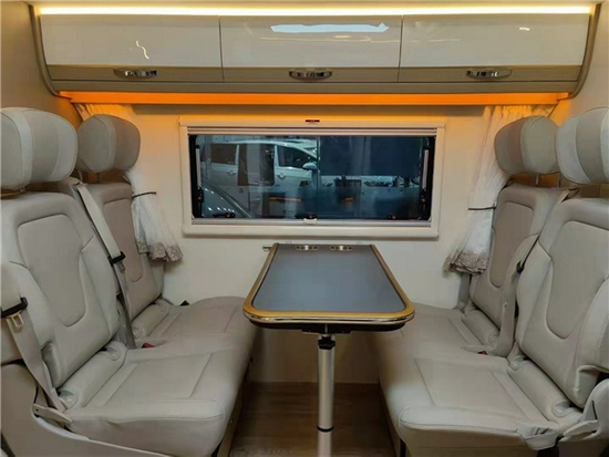 会客区采用对坐式卡座沙发设计,北欧风格布艺座椅造型,两侧座椅下方还有一定储物空间。搭配一张可升降式餐桌,临时可拼成一张沙发床;沙发内侧墙壁上有外推窗,推窗上方有储物柜,方便日常使用;卡座沙发后方则是一台152L赛特福德房车专用冰箱,冷藏冷冻都可以,不用担心食物变质,安全可靠;浅色内饰及顶部氛围灯则营造了温馨的家庭氛围。车内还配有进口DVD及音响等设备。