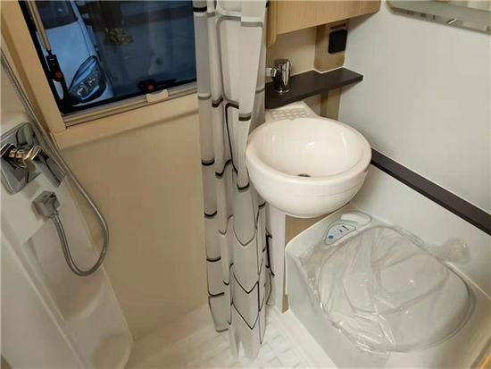 横置床左、右、后三面均配置有外推窗,用于通风散气。双拓展房车的厨房区位于中门左侧,配备有带盖式进口双灶头、带盖水槽、多功能微波炉、厨房抽油烟机、房车专用进口冰箱(152L)等,周围还有储物柜及一组220V电源插座。卫生间使用整体式复合防漏水卫浴系统,采用干湿一体式设计,内部配备进口赛特福德固定式座便器、美国进口Max换气扇、淋浴花洒等。