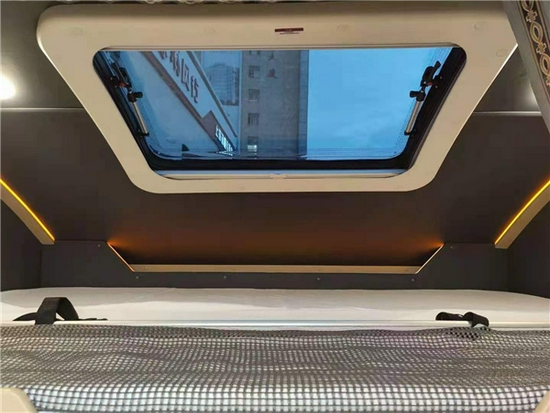 驾驶室上方额头区是一张双人床,左侧配备有室内爬梯上下,可满足两人休息;顶部和两边配有外推窗,以保证空气流通和满足采光需求。