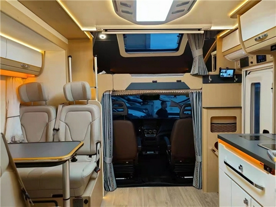 驾驶室与车厢后方为贯通式结构,中间配有布艺窗帘。驾驶室上方是额头双人床,额头两侧设有窗口,改善了采光效果,避免了小空间带来的压抑感。额头上方安装了弧形景观床,增加了内部的通光性,而且可以躺床上一览夜景,豪华影院级娱乐系统,最大限度地满足途中娱乐所需。