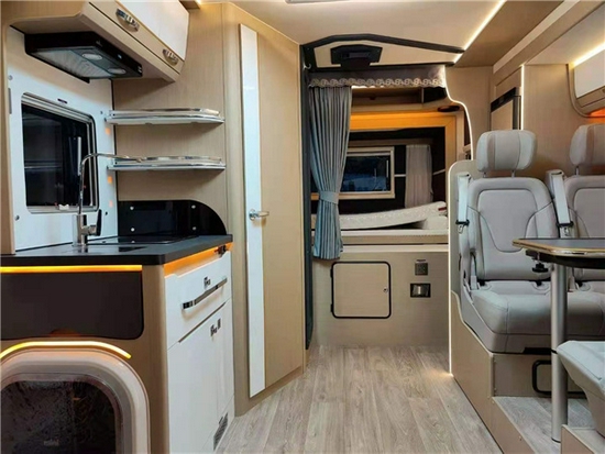 一体式厨房、现代风格的内饰设计,处处体现出生活品质的追求,配备厨房智能控制系统和微波炉,在厨房区域配备有水槽和燃气灶,均采用带盖式设计,平时不用也可以放置物品,还设置了一个盛放调味料等厨房用品的储物格,下方的抽屉可以装一些碗筷厨具,一体式厨房位于车厢右侧,储物柜、微波炉、油烟机、五孔插座、电磁炉、带盖水槽等配置较为常规,作为辅助外置厨房使用。