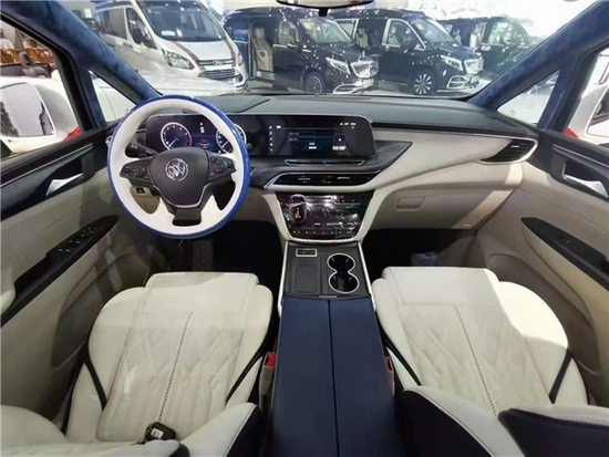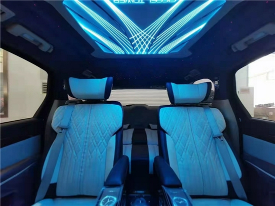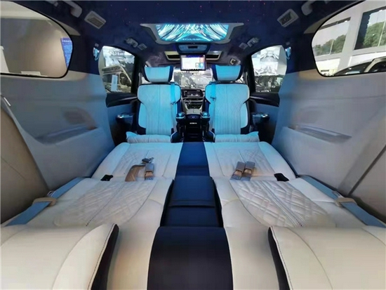 二排航空座椅(带电动退托、按摩、通风、加热) 全车罗马印花地板 前排折叠桌板带无线充电 折叠脚踏板,四门包覆 不锈钢迎宾踏板 吸顶DVD系统 艾维亚创意顶灯 车内氛围灯 星空顶 连体式前排中央扶手 一体式电动车载小冰箱。