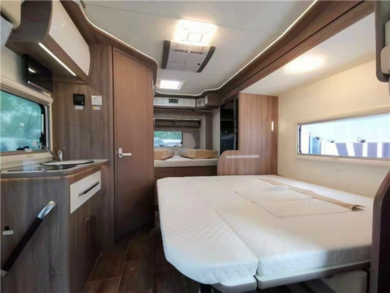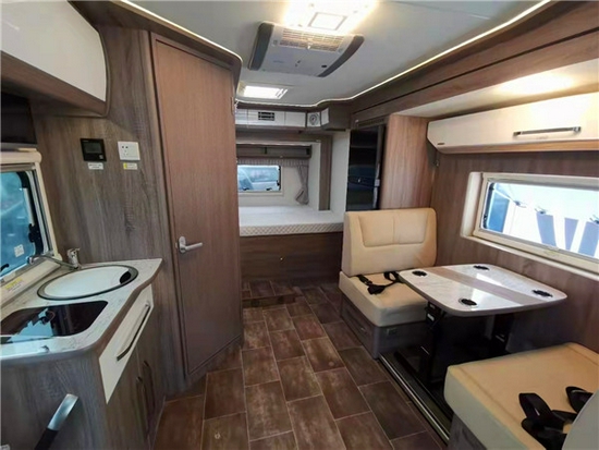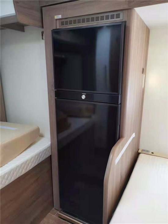 乘客门采用房车专用多功能欧式车门设计。厨房区位于卡座沙发对面,配备带盖式洗手池、电磁炉等,厨台侧面还配有上车扶手,细节用心;有别于其它车型,中央集成控制系统采用升降式13.3寸控制屏设计,红外感应触摸方式,可分区独立控制车内照明灯及电器设备开关等。卡座沙发后方配有一台多美达224L双开门车载冰箱,冷藏冷冻都可以,不用担心食物变质,安全可靠。