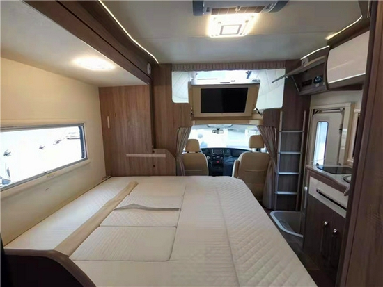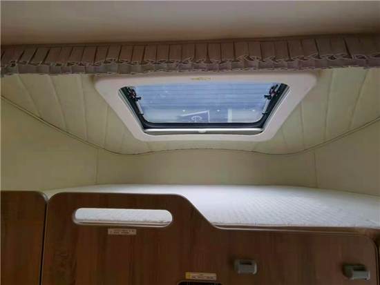 额头采用中额头设计整个空间进行了真皮的软包中间一面弧形的大天窗保证我们在额头区域的一个通风效果保证了在额头区域的睡眠效果。尺寸为2100×1200(mm),可通过室内爬梯上下便捷,能满足两名成年人休息;