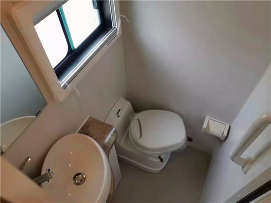 卫生间采用干湿一体式设计,内部配备多美达盒式座便器、洗手池、梳妆镜,换气扇及淋浴花洒等;也可选装赛特福德可旋转式座便器。水路系统方面,净水箱容积为180升、灰水箱容积为45升。