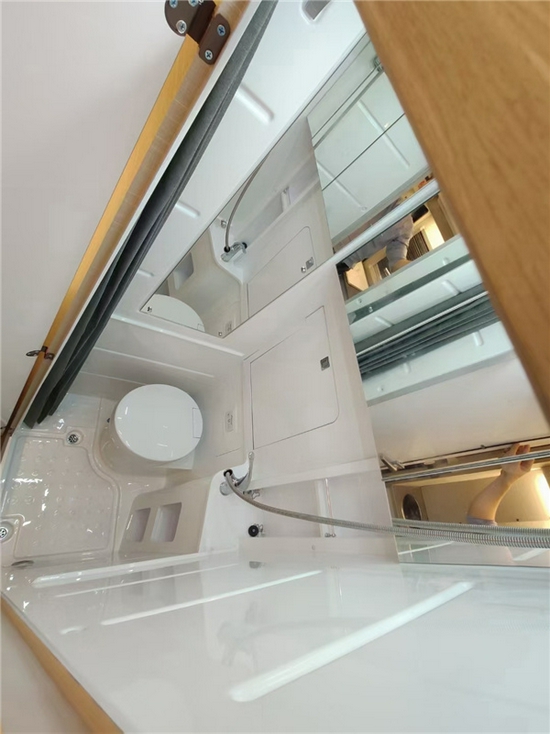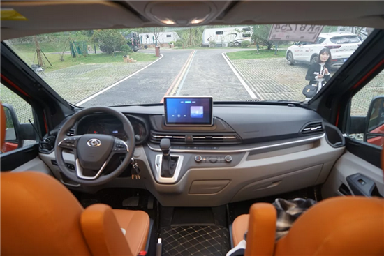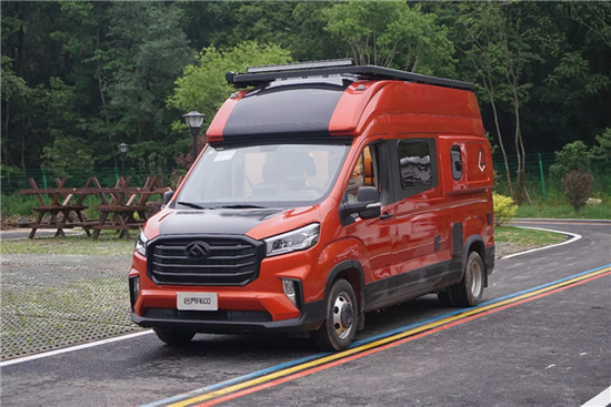 车内采用单排座椅卡座和后横床的布局,厨房和卫生间分布在中间区域的两侧。家具均采用E0级环保板材,整车配备多处窗口,加之巨大的前挡风玻璃和天窗,内部采光效果非常好。会客区采用双人位沙发卡座设计,侧边配备百叶窗。厨房采用可翻折的扩展台面,配置有85L双开门房车专用冰箱,以及微波炉、电磁炉等常规设备,顶部配有多个通风天窗,满足车内空气净化需求。