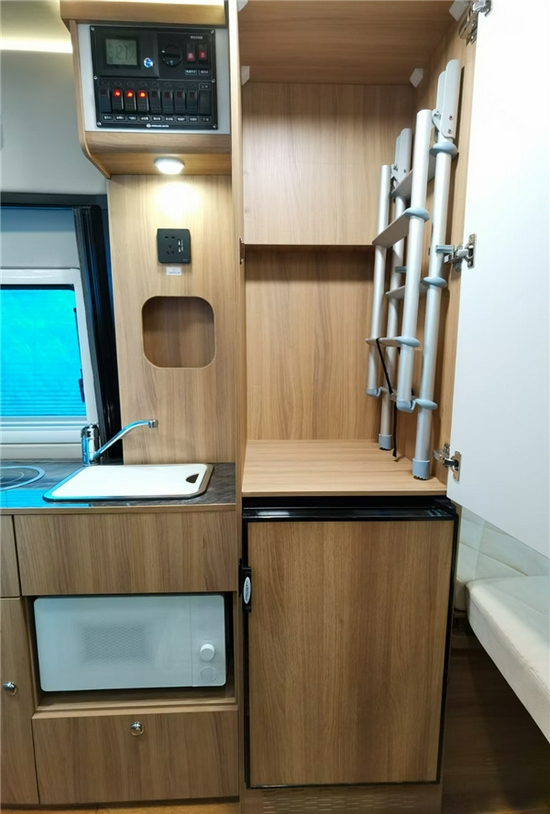 整个厨台采用大理石纹路的防火板饰面设计,厨台偏紧凑,带有一台火锅电磁炉和一款不锈钢洗菜池。说到用水方面,这款车标配150升净水箱和45升灰水箱,一家三口人生活用水。