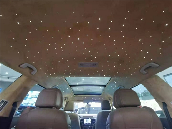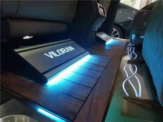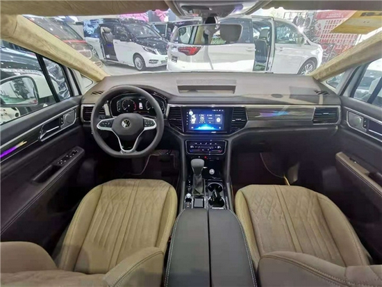 从第三排座椅往前看,这款大众威然还改了顶棚,顶棚进行了一个鹿皮绒包覆,触感更好,更易打理。主副驾座椅进行了真皮包覆,头枕更是与原车完全不同,时尚又刚柔并济。