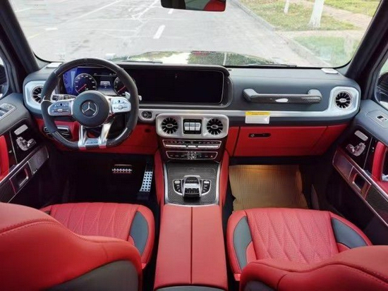 2021款全新G63内饰方面,新G63保留了新G500 (配置|询价)的整体设计,除配色差异外,新车还换装了全新造型的平底式AMG运动方向盘,其两侧配以打孔皮质包裹,下部镀铬装饰的造型也与新G 500明显不同,看上去十分战斗。此外,全液晶仪表盘+中控大屏的双12.3英寸屏幕设计在新车上也没有缺席,营造出了浓郁的科技感。