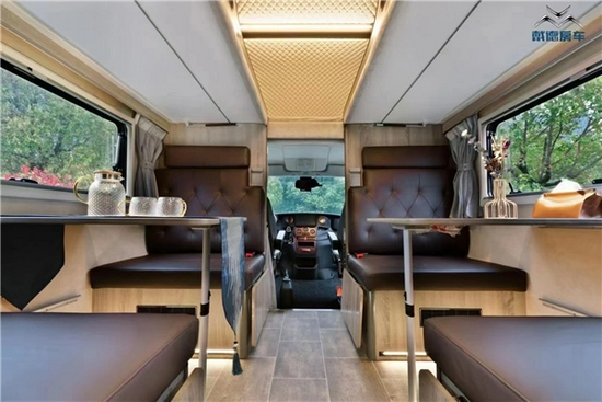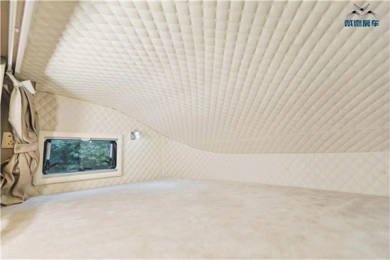 内饰的布局特别有意思,也是这款自由风 6 无拓后上门版房车的亮点。两侧对称设计,一边一组对向卡座,上方也各配置一张翻折的单人床,前端配置一个顶置双人床。中间的两组卡座沙发,对于乘员而言,无论是行车还是驻车,都能有不错的空间交互体验。对于床铺的规划,既能组成 1 个双人床 +4 个单人床的组合,又能组成 2 个双人床 +2 个单人床的组合,灵活多变,且都是全尺寸的床铺,完美解决多人出行的睡卧需求。
