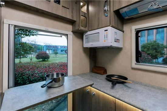 在会客区的过道里,设计了可推拉的24寸隐藏式电视机,日常生活时将电视机推入沙发后的墙体内,不占空间,需要时可以拉出来观看娱乐。即使是所有人躺在床上也可以一起看电视。厨房区位于车尾后门进入,这样的设计有益于更好的排烟和保障车内空气的质量。厨房区配有微波炉、电磁炉以及不锈钢水槽等,为了增加料理台的使用面积,车门处还做了翻折式桌板的设计。