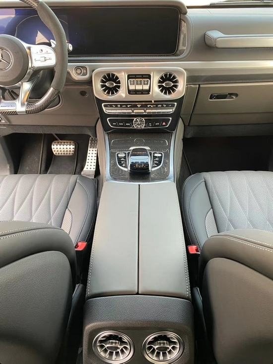 奔驰G63采用了奔驰最新的双屏幕式设计,全液晶仪表盘和中控台屏幕都达到12.3英寸。同时内饰质感和工艺都有了很大的进步。较之于现款车型,它的内饰发生了巨大的变化,融入了不少现款奔驰S级 (配置|询价)、E级的设计元素,从而变得更加豪华,而家族式的连屏设计则凸显了车内的科技感。当然了,经典的“三把锁”按键自然不会缺失,并且设置在中控台最为显眼的位置。