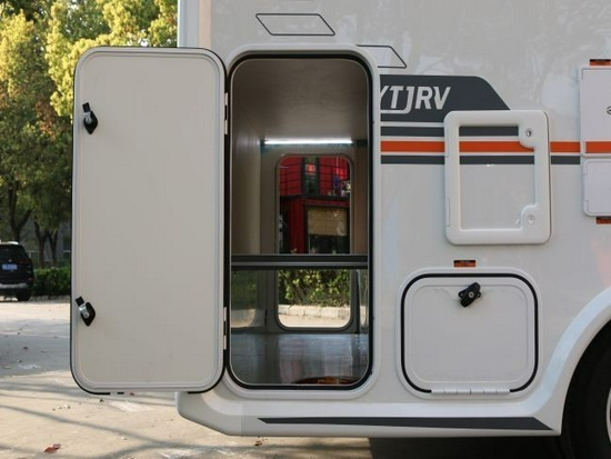 车身外部提供了比较丰富的外部设备,手动遮阳棚、抽拉式燃气灶、储物箱、驻车平衡支腿等,外置翻板,水电接口,排气口等,对于日常使用的便利性有着不小的提升