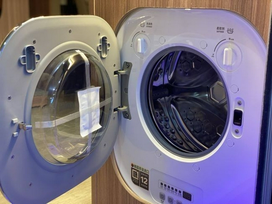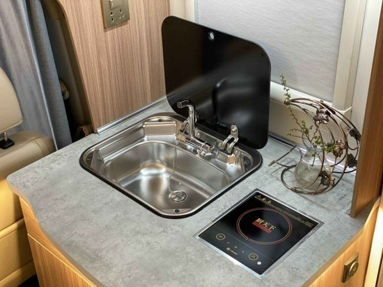 厨房区位于车厢中上门前方,由于车外配备了燃油灶,为此车内的厨房个人建议仅作为应急使用。厨房配有带盖式不锈钢水槽+水龙头、电磁炉、微波炉、房车专用抽油烟机及韩国大宇2.5kg洗衣机;周围储物柜可存放日常生活碗具。