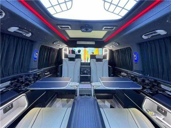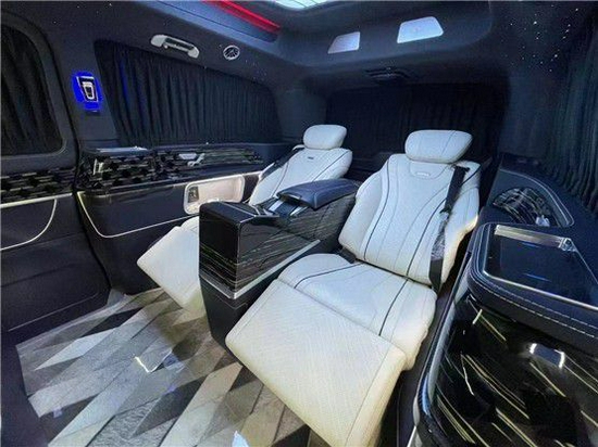 奔驰 V260L 改装商务房车后排座椅奔驰 S 级航空首长席座椅,与秘书座一样是用舒适柔软的意大利豪华进口 Nappa 小牛皮纯手工打造,座椅前后、头枕、脚托均可根据实际需要进行调节,调整到您觉得舒适的位置,加热、通风、气动按摩、一键展开呈 135度; 人体工程学睡眠角度,一键收回、10项电动调节、调节记忆等功能任君选择。