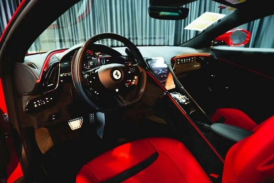 Roma内饰采用数字化座舱设计,方向盘上大部分功能都是通过触控实现,仪表盘也采用了造价很高的曲面屏。为了避免副驾在旅途中无聊,在副驾前面加入一块屏幕8.8英寸触控屏幕,除了可以显示性能数据与车辆状态外,还有导航、多媒体、空调的功能控制。