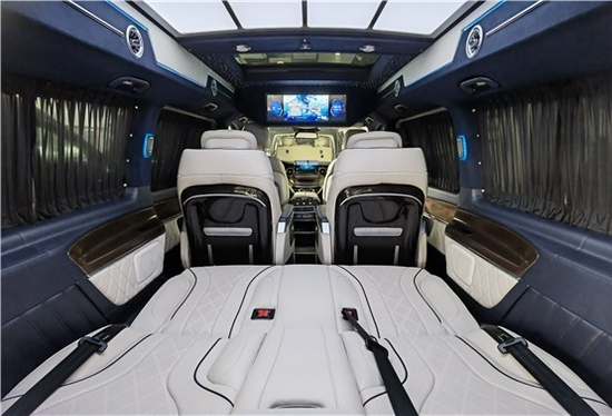 V260L版以下是贵宾舱二个总裁座椅,这二个座椅具有记忆功能,何为记忆功能呢?就是一键展开及一键收回,这个座椅是根据人体工程学设计而成,能一键式找到您身体最舒适的角度。在总裁座椅双侧有两个隐藏式桌板。总裁座椅中间有个热感电子触摸屏幕可控制后舱设备,屏幕下方有个“语音控制系统”也可控制整个贵宾舱的设备。