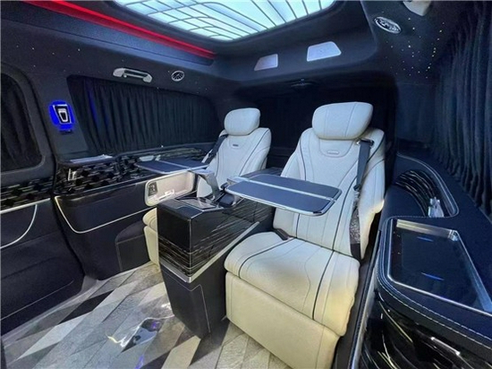 奔驰 V260L 改装商务房车后排座椅奔驰 S 级航空首长席座椅,与秘书座一样是用舒适柔软的意大利豪华进口 Nappa 小牛皮纯手工打造,座椅前后、头枕、脚托均可根据实际需要进行调节,调整到您觉得舒适的位置,加热、通风、气动按摩、一键展开呈 135度; 人体工程学睡眠角度,一键收回、10项电动调节、调节记忆等功能任君选择。