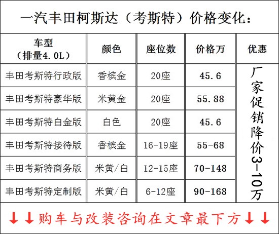 丰田考斯特/一汽丰田柯斯达 (配置|询价)销售改装内饰价格订制私人订制商务房车:6座7座8座9座企业豪华接待专用:10座11座12座13座14座15座政府通勤采购商务:16座17座18座19座20座23座。统一出场合格证大量现车,全国最大最专业的丰田考斯特销售改装大厂,全系低价售全国,全国上牌!