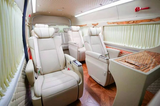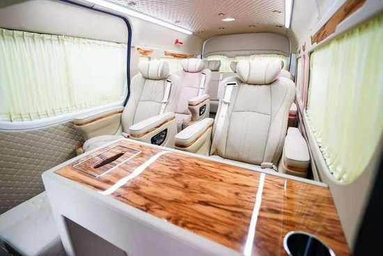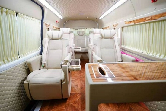 丰田海狮9座内饰配置:DVD智能24寸显示器、卡拉OK系统、折叠桌、导航、倒车影像、仪表实木内饰、主副驾驶真皮、主副司机实木内饰、内饰把手实木、空调出风口实木、全皮软包内饰顶棚、两侧航空灯、两侧窗帘、两侧装饰框及中门尾门、全新设计艺术办公桌(纸巾盒、杯架、抽屉)、220V电源、四张埃尔法 (配置|询价)样式航空座椅电动前后、电动靠背、脚托、加热、按摩、通风、模具塑料真皮扶手(镶嵌实木装饰)、三人连体加宽加大加厚沙发、艺术定制地板、两侧饰板软包、车内两侧饰板加装隔音隔热棉及止震垫等等…