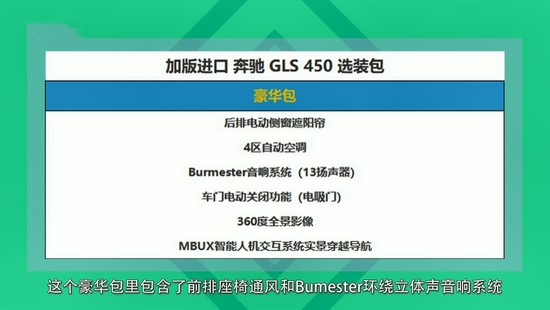 第三个是大灯,美加版标配了几何多光束LED大灯,而中规只有顶配豪华型有此配置,中配时尚型需要选装,选装价格11500元,而低配的GLS 400则没有提供此项选装。