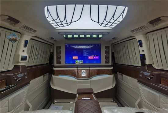 奔驰V260L商务车改装四座版隐藏6座(对坐版)房车娱乐性功能体现倒也是别具一格,40寸升降液晶电视也被首次引入奔驰V260房车的设计,此外前、后置高保真音响组合立体环绕式声场,一套移动式家庭影院的私享配备。前后舱无隔断设计应该属于更偏向于家庭化的设计了,驾驶舱扶手箱后侧多是一些实用的功能体现,诸如恒温杯托、后舱电器触控屏等;那么如果是多用于商务接待,全隔断式的奔驰V260房车是个不错的选择。