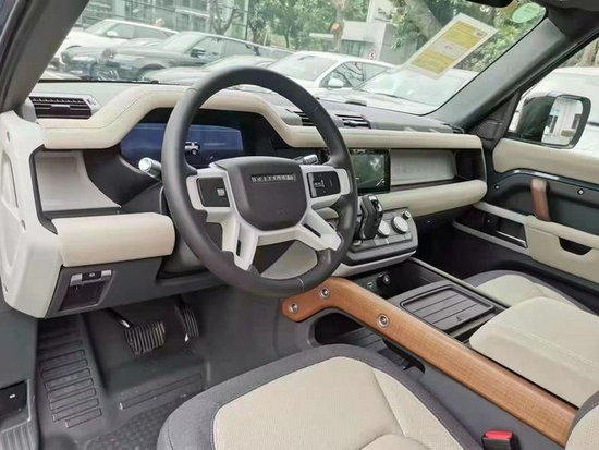 路虎卫士90的内饰可选多种配色方案,采用前卫的简约混搭风格,在保持卫士硬朗越野风格的基础上,引入了更多科技元素,应用了更加高档材质,进一步提升了卫士90的科技和豪华感。四幅式方向盘,采用直接裸露的镁合金材质辐条,仅是喷涂了磨砂质感的漆,触感略有粗犷的颗粒感,中间的安全气囊则用细腻的皮质包裹,多功能按键表面使用纳米材质,使用触感和防污特性均非常出色。