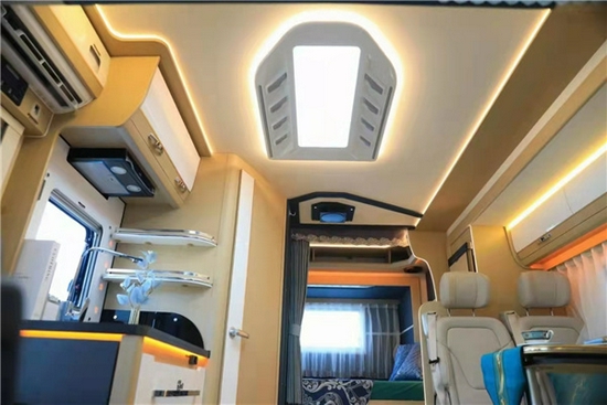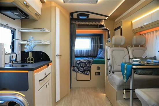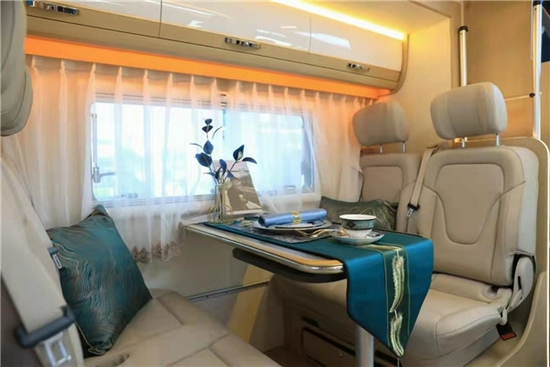 车厢中部为会客区,左侧设有双人对坐沙发卡座,上方配有储物柜,卡座中部升降桌放下后可拼成床铺,外出旅行时可以睡两名儿童;卡座沙发后边设置了150L进口直流冰箱,满足旅行途中的食品保鲜;