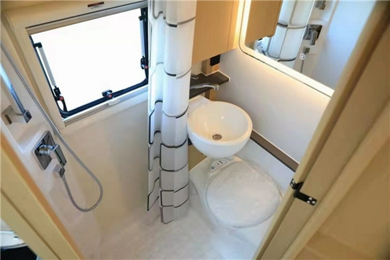 厨房智能控制系统和微波炉,在厨房区域配备有水槽和燃气灶,均采用带盖式设计,平时不用也可以放置物品,还设置了一个盛放调味料等厨房用品的储物格,下方的抽屉可以装一些碗筷厨具,一体式厨房位于车厢右侧,储物柜、微波炉、油烟机、五孔插座、电磁炉、带盖水槽等配置较为常规,作为辅助外置厨房使用。