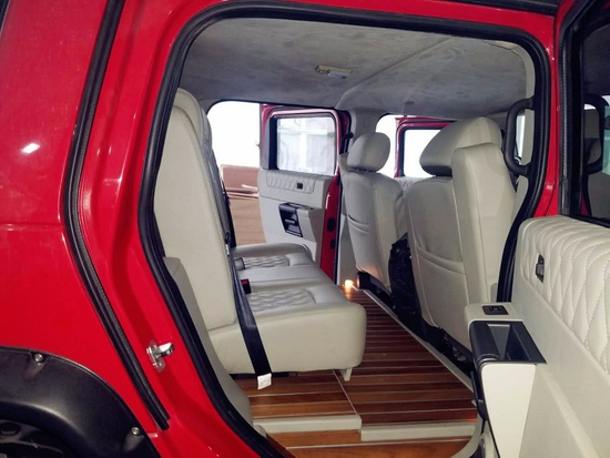 悍马车内变成了四座布局,中间放置了一个小隔断吧台,地板采用游艇级柚木地板,车顶是九宫格顶灯和星空顶,颜色变换多,这些配置的搭配和豪华商务车内饰相似,坐在越野悍马上就能享受到豪华商务车的体验。