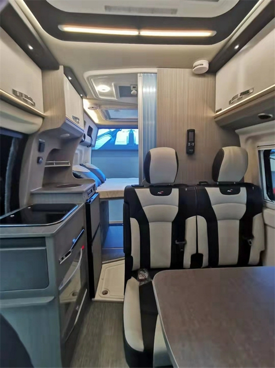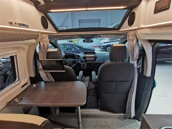 驾驶仓区域,搭配着多功能的方向盘,具备调节音量,接听电话,定速巡航等功能。中控台配置液晶显示屏,搭配导航倒车影像系统可更好地让司机驾驶房车,提高行车安全性。正副座椅皮革包覆,给驾驶舱的乘客提供更好的乘坐体验。