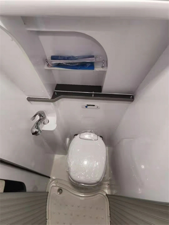 将卷帘拉动至关闭位,卫生间内配有赛特福德旋转式马桶、梳妆镜、卫浴组合柜、折叠式毛巾架、以及多功能豪华卫浴系统。瑞弗2020年全系卫生间均采用双地漏设计,更快的下水保证卫生间不会积水然后漫至车内,启界R500水路方面采用90L的清水箱,40L的灰水箱、以及集成容量为17.5L的抽拉式黑水箱。