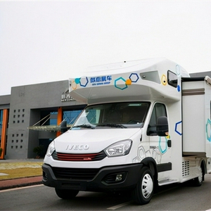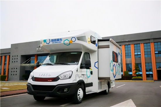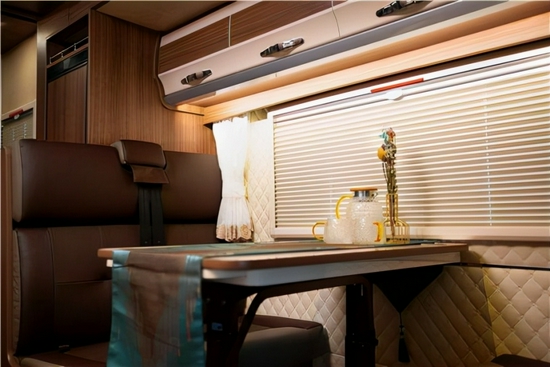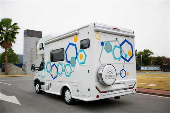 小清新的六边形车身印花加上白色玻璃钢车身,带来了一种超现代的清新风格。全车采用了游艇免漆工艺,质感十足。车身的左方和后方带有电动拓展仓,带来更大的空间享受。加宽的后桥有效提高了车辆的承载力及稳定性。
