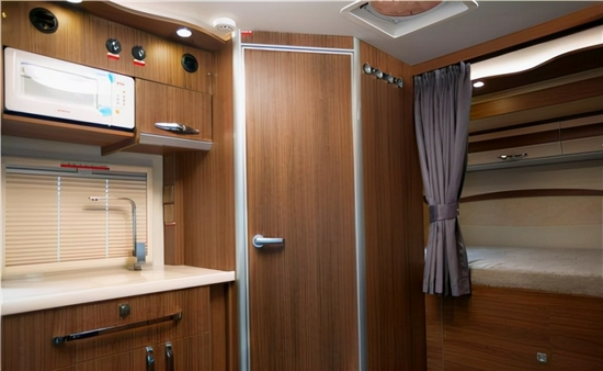 会客区由双人对坐沙发与可升降餐桌组成,日常可乘坐3-4人,夜晚则可将餐桌降下,变成一张1900X945mm的单人床位,增添房车内可休息人员的数量。搭配合适的外推车窗,在驻车休息时,可以享受微风拂面的畅爽。同样位于车厢中部的还有厨房区,配有电磁炉和带盖板的洗菜池,搭配48V160L双门冰箱(可升级)、微波炉的组合,能够满足短期出游储存食材与烹饪的需求。同时,装设燃气泄漏探测器+烟雾+CO报警器,为烹饪时的安全问题保驾护航。