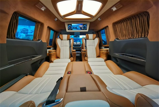 时尚内饰装饰,电动布艺窗帘,高级皮革+麂皮绒包覆车壁,奢华的LED车顶灯。支持私人定制和选配升级改装,现车在店看好可提!