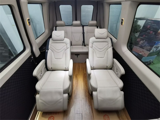 商务舱用的是游艇木的地板,多宫格的顶灯,而且在顶部周边的氛围灯用暖色调色组成,非常的温馨与时尚。总体来统观这辆商务车的内部来看呢,豪华的配套设施一样都没少,整个内饰的设计风格也非常符合商务车的标准与模范。