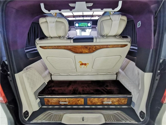 第三排是一个三连排的沙发床,可以180度的进行平躺,如果将旋转过后的座椅腿托升起,即可立马组成两米长的大床。全车配备了窗帘,既可以保证车内日常的隐私性,也可以阻挡阳光的直接照射,不管白天还是晚上,都可以休息的非常好。 统整车内饰的风格布局,颜色搭配协调,稳重的同时不失优雅,高端的雀眼枫木作为木件装饰,提升整车质感,显示着与众不同。