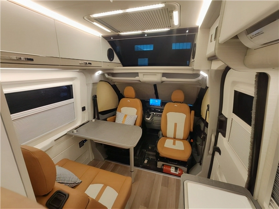 驾驶室后方就是生活区空间了,在定位上是为2人旅行设计的,包括客厅、厨房、独立卫生间及车尾卧室,车内高度表现不错,平均高度达到了1.92米。水电配置方面,新车标配400Ah/12V锂电池、3000W逆变器、130升食品级净水箱及60升灰水箱。