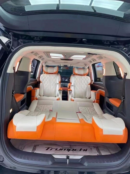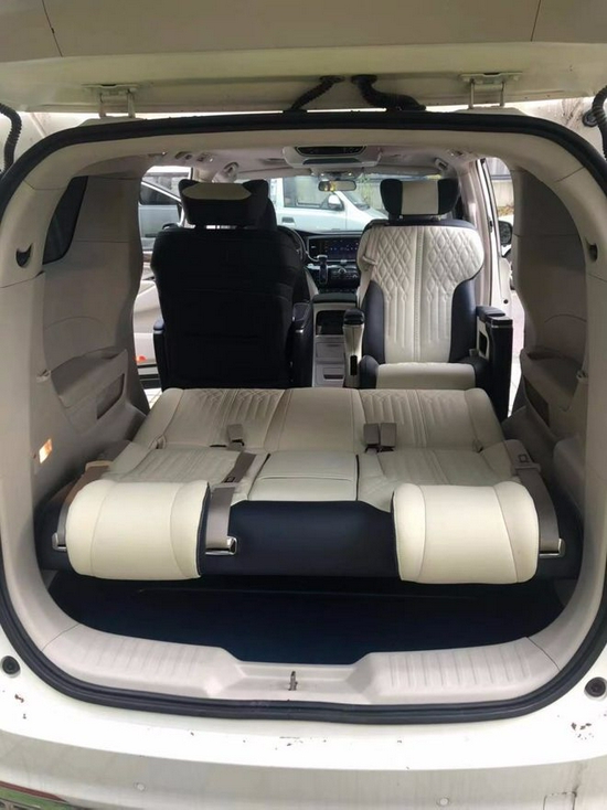 此款传祺M8改装了埃尔法款航空座椅、大理石地板、主副驾、不锈钢门槛、第三排沙发床、个性顶灯、车顶满天星、车顶棚软包鹿皮绒、电动门等奢华配置,它是由低配的车型改装而来,性价比超高,整车改装花费约6万元,但是如果光看内饰已经明显超越了100多万的丰田埃尔法。中排航空座椅具备丰田埃尔法尊贵版的基本功能,舒适度甚至比埃尔法还高,其具备手机充电,按摩、加热、通风、电动前移动、靠背电动放到,电动腿托等强大功能