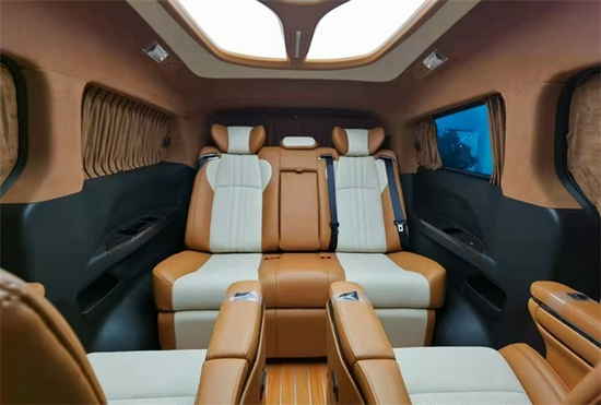 装饰很是吸引人。时尚内饰装饰,电动布艺窗帘,高级皮革+麂皮绒包覆车壁,奢华的LED车顶灯。支持私人定制和选配升级改装。