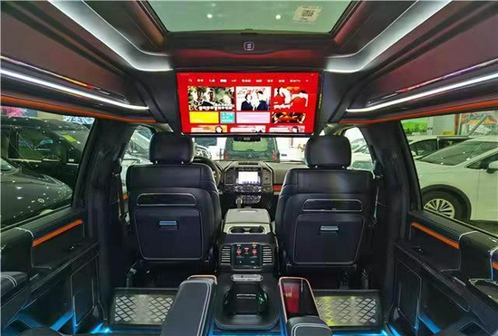 二排设置了两张带独立腿托的CEO级航空电动按摩座椅,下铺进口柚木地板,福特勇猛者独创半隔断式布局,使整车空间使用率达到最大化,还增加了升降电视机多功能吧台等设计。总体空间感十分宽敞,适用于商务接待或家族旅行。不仅座椅有良好的舒适体验感,而且整体的空间感对比市面上一些竞品SUV优势还是很明显的。顶部半隔断的车载无线网络电视机,以及下方吧台,为我们提供日常休闲娱乐的器械配置,再配合顶部天窗和后部的三色宫格顶灯相结合,搭配整车的线条式氛围灯,凸显整车的层次感,也烘托了整体的氛围。
