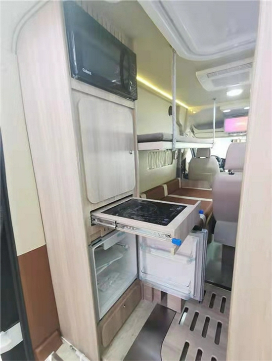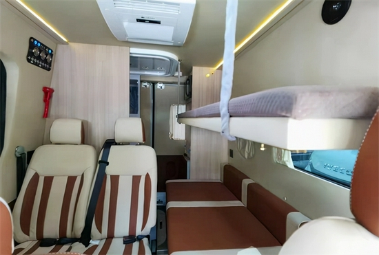 整体的内饰风格偏美式,大气简约,车内卡座区搭配可升降桌,方便出行中吃饭娱乐会议等需求。车内搭载吊床以及沙发床,沙发床还可以拉开变型成为一张大床,休息区平时睡三个人没有丝毫压力。
