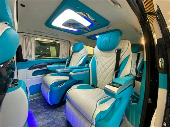 方向盘为三幅运动设计,中控采用了时下流行的悬浮科技中控屏装配。驾驶室座椅中间还加配了车载冰箱。精练的奔驰威霆改装整车加装了登车踏板、全车镀铬套件、LED迎宾踏板、超纤真皮包覆,使整车更加尊贵霸气。