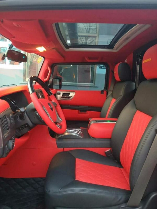 悍马车内变成了四座布局,中间放置了一个小隔断吧台,地板采用游艇级柚木地板,车顶是九宫格顶灯和星空顶,颜色变换多,这些配置的搭配和豪华商务车内饰相似,坐在越野悍马上就能享受到豪华商务车的体验。
