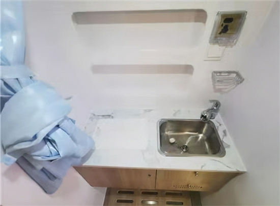 卫生间可以看到配备了220V的电源插座以及毛巾架,下方有个不锈钢的水槽和抽拉式的水龙头,洗漱和淋浴都是非常方便的,下方的不绣钢防滑地板保证安全性以及不用担心渗水的问题。