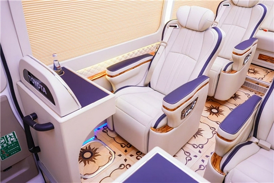 超豪华独立航空座椅,其功能多样化,加热、通风、按摩、脚托、扶手应有尽有,进口航空地毯,百褶窗帘,空壳顶灯,32寸车载专用显示器,冰箱。专为商务精英团队与高端家庭用户打造的丰田考斯特多功能商旅车。