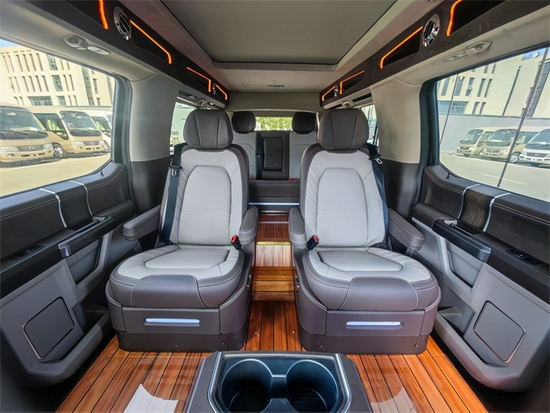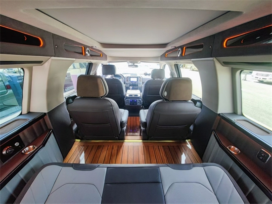 2021款 F-150福特勇猛者高顶福特勇猛者现车-高顶内饰上两款全新福特勇猛者也有很大区别,后排座椅高顶配备了航空按摩座椅带有腿托,而平顶车型则没有,另外高顶车型还铺了进口柚木地板在豪华感上高顶车型要领先平顶很多,因为高顶车型更注重商务功能,车内装饰都是经过重新设计的。第三排座椅腿部空间确实给力,就是头部空间比较局促,