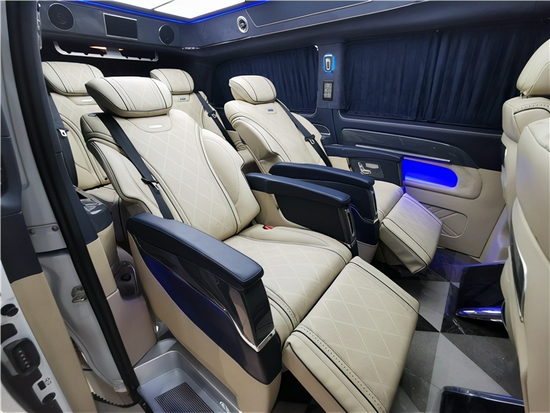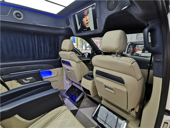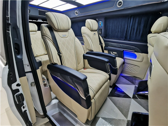 奔驰威霆高顶商务车,后排沙发床座椅,可以180度平躺放倒,旅途的时候累的时候可以休息,全部电动调节前后,靠背调节。全隔断弧屏升降互联网电视,全隔断的好处是把正副驾驶和后仓隔离,加上影院级别的电视,让后仓的老板们充分感受到私密性。威霆高顶全隔断弧屏升降电视商务车,高顶的好处在于后仓的空间不压抑,感觉特备舒适,适合企业老板商务接待,居家自驾旅游。