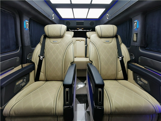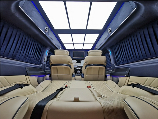 整车做了Bose音响环绕更加有品格,顶部28寸的半隔断电视、正副驾驶座椅背后两个独立的小桌板搭配全车的隐私窗帘,给你一个完美的私密环境,顶部做了翻毛皮的处理,触感更好,观感更美,全车铺设高光镜面亚克力地板更加凸显奢华。