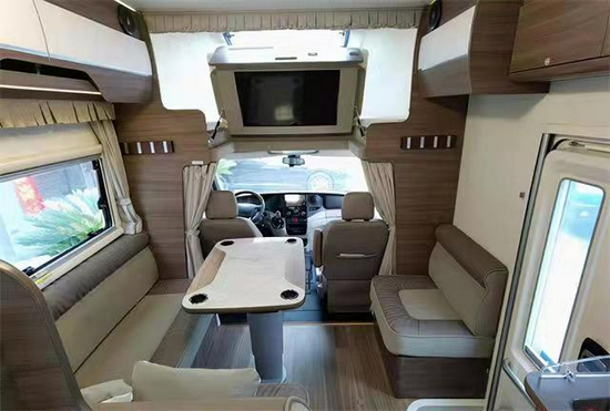 会客区采用环形沙发布局,形成4-6人的会客空间,中间桌面为万象桌板,可进行前后、左右、上下移动调节,驾驶室副座椅可向后旋转,形成四方桌 后可以打麻将,开会,唠嗑,打扑克,吃饭,多样化功能。同时桌子还可以上下升降,降下去之后形成一个床,睡儿童,睡成人均可。